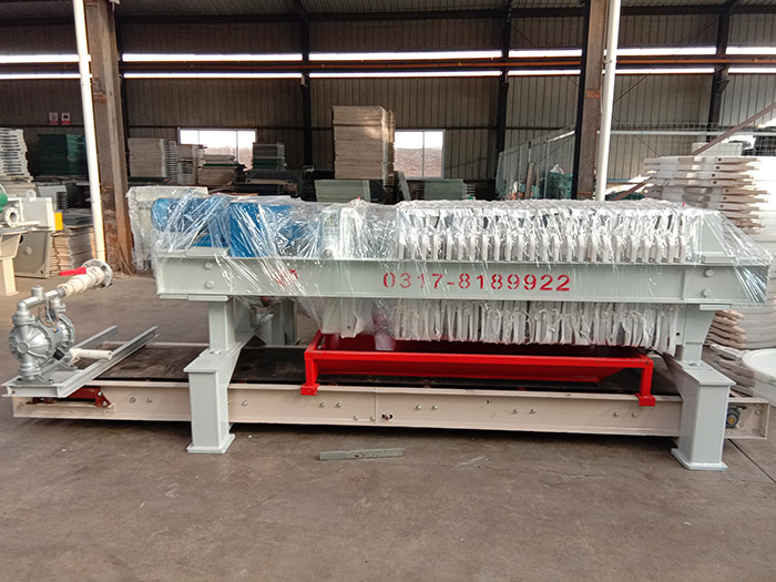 用泵將待過濾的懸浮液輸送到已壓緊的各個濾室中,壓濾機(jī)懸浮液中的液體透過濾布,通過各濾板上的濾液孔排至機(jī)外,懸浮液中的固體顆粒則積聚于濾室中,并逐漸形成濾餅。